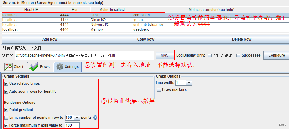 Windows下: 双击startAgent.bat或在命令窗口输入startAgent.bat。 Linux下 1、cd到ServerAgent的目录下。 2、修改startAgent.bat的权限为777:chmod 777 startAgent.bat 3、启动:sh startAgent.bat 4、修改端口:java -jar ./CMDRunner.jar --tool PerfMonAgent --udp-port 7879 --tcp-port 7879 将记录日志转换成图片 java -jar CMDRunner.jar --tool Reporter --input-jtl PerfMon.jtl --plugin-type PerfMon --generate-png report.png
